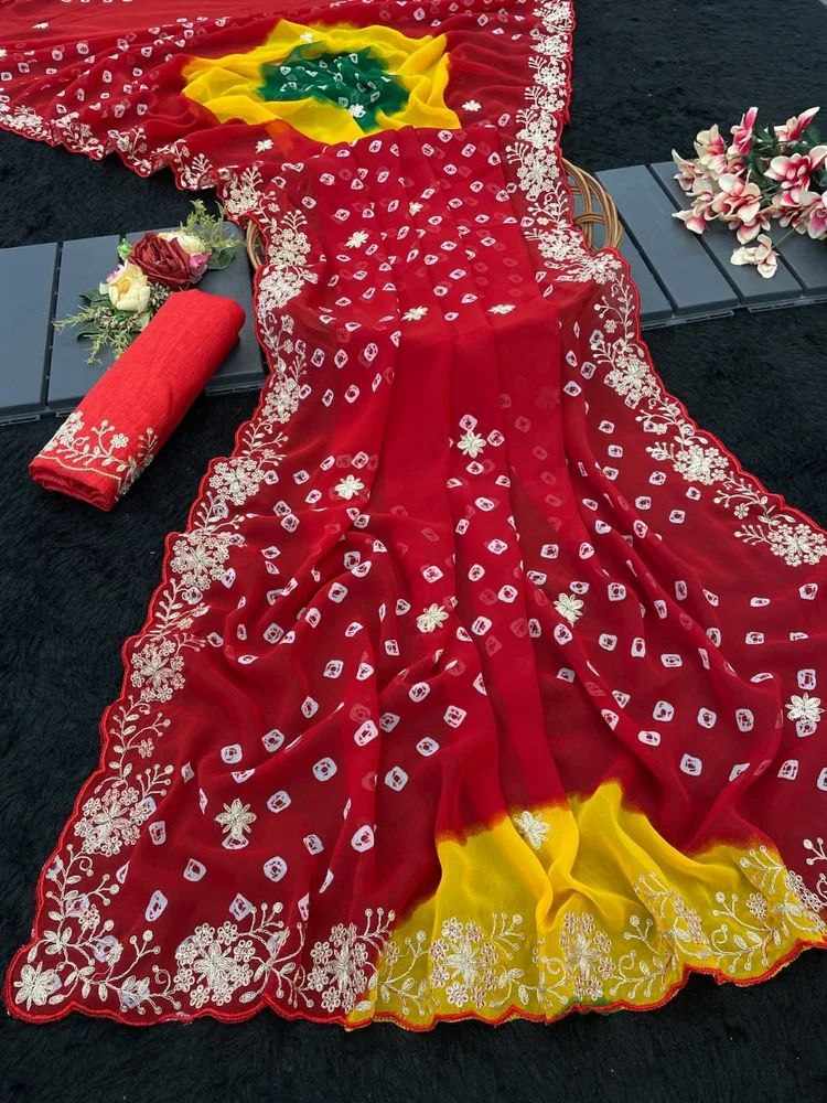 | Name : | PIYU P1038 MULTI COLOR RED BANDHANI Saree |